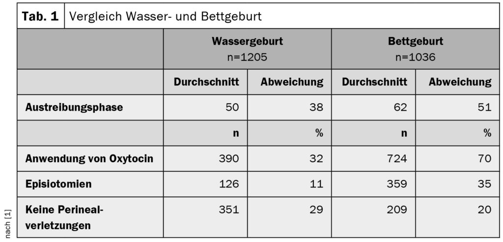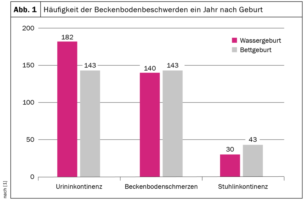 Wie erwartet werden Episiotomien bei Geburten im Wasser weniger häufig durchgeführt. Auch die Geburt selbst ist bei Wassergeburten signifikant kürzer und es wird weniger Oxytocin benötigt. Darüber hinaus blieb der Damm bei Wassergeburten vermehrt intakt. Ein Jahr nach der Geburt haben Urininkontinenz und Beckenbodenschmerz keinen signifikanten Unterschied ergeben. Die Stuhlinkontinenz hingegen, insgesamt ein sehr seltenes Ereignis ein Jahr postpartal, zeigt einen signifikanten Unterschied zugunsten der Wassergeburt (Tab. 1, Abb. 1) [1].