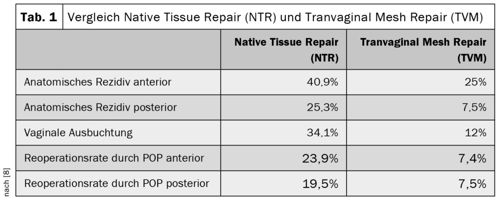 Die Behandlung des Beckenorganprolapse erfolgt in der Regel chirurgisch, mit dem Ziel, die Anatomie der die Beckenorgane stützenden Strukturen wiederherzustellen. Die chirurgischen Reparaturtechniken werden, wenn nur Beckenorgan-Stützgewebe verwendet werden, als «Native Tissue Repair» (NTR) klassifiziert und als «Augmented Repair» (AR), wenn ein anderes Material verwendet wird, um das defekte Stützsystem zu verstärken. Die Erfolgsrate der NTR liegt mit 30-100% bei einer großen Spannbreite. Bei den wiederkehrenden Prolapsen hingegen hat sich gezeigt, dass NTR nur noch mit 50% erfolgreich sind [4]. Die scheinbar nicht befriedigenden Resultate der NTR haben 2004 die Entwicklung sogenannter transvaginaler Mesh Kits gefördert, synthetischen Netze, die die Wände der Vagina stützen sollen. Diese fanden schnell eine große Verbreitung und ergaben auch ein besseres anatomisches Ergebnis. Studien zeigen allerdings, dass Frauen die Lebensqualität mit Mesh Kit nicht als besser beurteilen, was ein besseres funktionelles Ergebnis einschränkt [5].