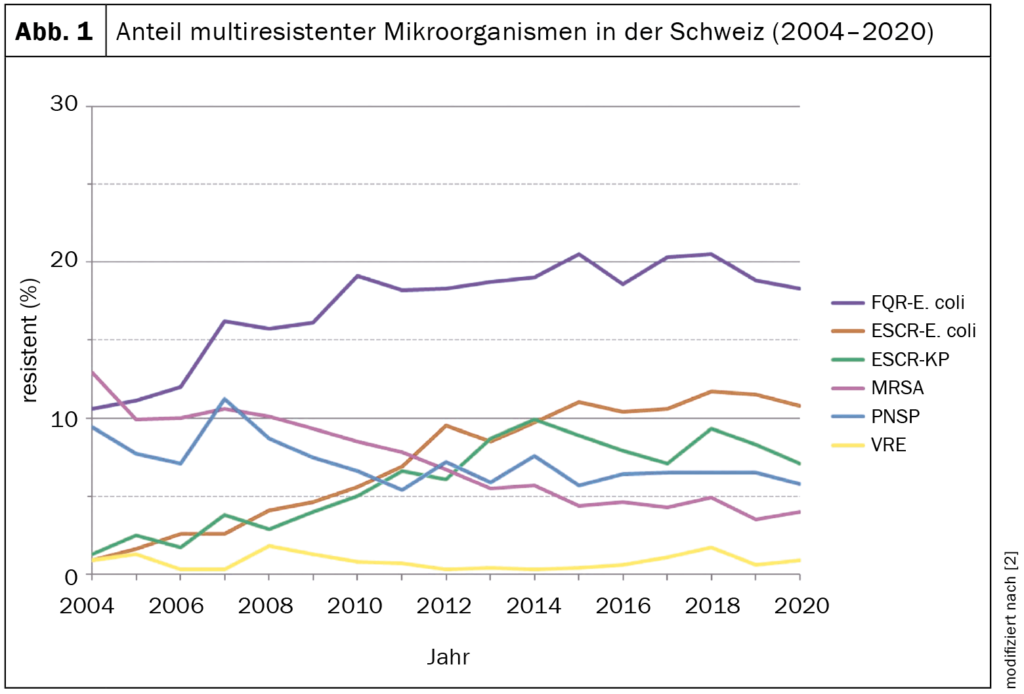 Bei einigen Bakterienarten haben Resistenzen stark zugenommen, bei anderen Arten ist die Antibiotikaresistenz stabil geblieben oder zurückgegangen. Im Fall von Escherichia coli, ein häufiger Verursacher von Blasenentzündungen, hat die Resistenz gegen Fluorchinolone zugenommen; die Resistenz gegen eine Klasse von Breitband-Antibiotika, wie Cephalosporine der dritten und vierten Generation, ebenso. Im Fall von Klebsiella pneumoniae, eine Bakterienart, die häufig die Harn- und Atemwege infiziert, hat die Resistenz bis 2014 ebenfalls deutlich zugenommen. Die Schweiz liegt bei den Resistenzen im internationalen Vergleich im Mittelfeld. Relativ zur Bevölkerungsgrösse werden hierzulande weniger Menschen von resistenten Bakterien befallen als in Frankreich, Italien oder Grossbritannien, aber mehr als in den skandinavischen Ländern und den Niederlanden. Die aktuelle Resistenzsituation in der Schweiz wird in (Abb. 1) [2] dargestellt.