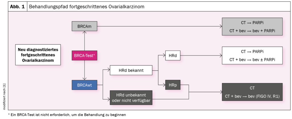 Auf die Diagnose fortgeschrittenes Ovarialkarzinom sollte eine BRCA Testung folgen, da die genetische Testung einen signifikanten Einfluss auf die Erstlinientherapie hat. Sind die Krebszellen BRCA-mutiert (BRCAm) besteht die Option einer Chemotherapie plus Erhaltungstherapie, eventuell kombiniert mit Bevacizumab. Sind die Krebszellen nicht BRCA-mutiert (BRCAwt) sollte eine HRd-Testung erfolgen. Liegt eine HRd-Mutation vor (HRd) kann auch in diesem Fall eine Chemotherpie plus Erhaltungstherapie erfolgen. Liegt keine HRd-Mutation vor (HRp) erfolgt lediglich die Chemotherapie, eventuell kombiniert mit Bevacizumab (Abb. 1) [1]. In der Regel sind Ovarialkarzinome zu 25% BRCA und HRd-mutiert, weitere 25% sind nur HRd-mutiert und die restlichen 50% sind weder BRCA noch HRd-mutiert. Liegt sowohl eine BRCA als auch eine HRd-Mutation vor, kann also eine Erhaltungstherapie mit Niraparib, Olaparib oder Olaparib plus Bevacizumab erfolgen. Zusätzlich besteht bei einer HRd-Mutation die Möglichkeit Niraparib oder Olaparib plus Bevacizumab zu verabreichen. Liegt weder eine BRCA oder HRd-Mutation des Ovarialkarzinoms vor sind PARP-Inhibitoren in der Schweiz bisher nicht zugelassen.